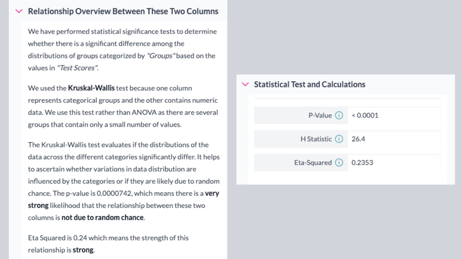 - Eta-Squared: this indicates the strength of the relationship between categorical groups and numerical data. It shows what proportion of the total variance in the numerical data can be explained by the differences between the categorical groups.